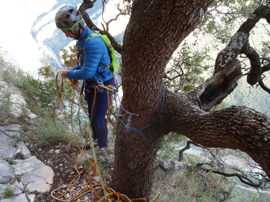 Montando el primer rápel para acceder a la línea de rápeles..
