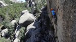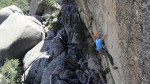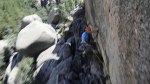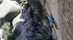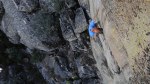 Durante el siguiente largo, un 6b que se me hizo horriblemente duro, siguió lloviendo bastante.. pero poco a poco la tormenta se fue alejando. Tuvimos mucha suerte de que la tormenta hiciera ese cambio de rumbo a última hora, ya que no sólo nos habría puesto las cosas dificiles durante el resto de escalada, si no que el camino de descenso era a través de un barranco, muy ancho al principio pero bastante angosto en algunos tramos a partir de ahi.