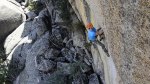 Después de haber pasado tanto calor durante los días anteriores, decidimos a pesar de la orientación de la pared entrar en la pared prontito. A las 7 estábamos empezando la vía. Empalmamos los dos primeros largos para intentar acelerar un poco las cosas y a partir de ahi 8 largos seguidos de séptimo grado, a excepción únicamente de un 6c entre medias.