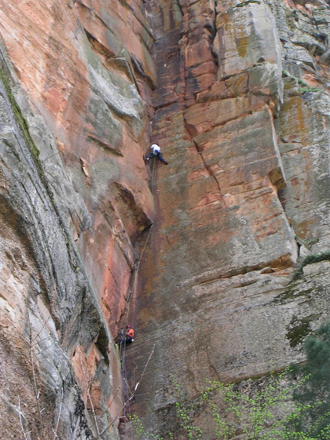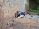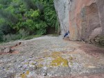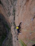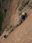 Durante el siguiente largo, un 6b que se me hizo horriblemente duro, siguió lloviendo bastante.. pero poco a poco la tormenta se fue alejando. Tuvimos mucha suerte de que la tormenta hiciera ese cambio de rumbo a última hora, ya que no sólo nos habría puesto las cosas dificiles durante el resto de escalada, si no que el camino de descenso era a través de un barranco, muy ancho al principio pero bastante angosto en algunos tramos a partir de ahi.
