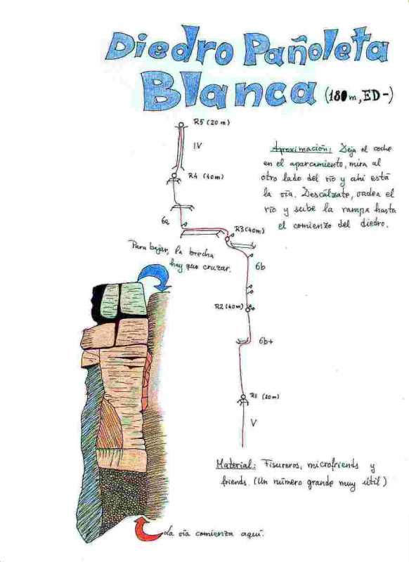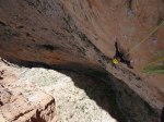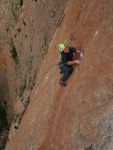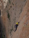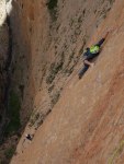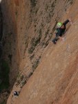 Después de haber pasado tanto calor durante los días anteriores, decidimos a pesar de la orientación de la pared entrar en la pared prontito. A las 7 estábamos empezando la vía. Empalmamos los dos primeros largos para intentar acelerar un poco las cosas y a partir de ahi 8 largos seguidos de séptimo grado, a excepción únicamente de un 6c entre medias.
