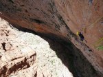 Yo no había tenido la oportunidad de rodar en deportiva antes del viaje, a excepción de alguna placa pedricera que entrena más los gemelos que otra cosa. A pesar de ello, las sensaciones fueron inmejorables para los dos, disfrutando como enanos durante toda la escalada. Al llegar al L11, el más duro, decidimos darnos un aire, comer y beber algo e intentar recuperar algo de energía para liberar completamente la vía. Cuando empezábamos a sentirnos cómodos en la repisa, Edu cambio el semblante y me miró con estupor señalando el horizonte. Mordor se avecinaba, el aire empezó a levantarse y algunas gotas traidas de muy muy lejos empezaron a mojarnos. Edu se puso nervioso, se calzó, se apretó el arnés y empezó a escalar.