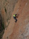 Nos quedaban 5 largos y había que salir pitando! Estaba en la mitad del largo cuando empezó a tronar muy fuerte y Edu empezó a preguntar que hacer al llegar a la reunión.. ¿Bajamos o seguimos subiendo? Yo compartía ya la repisa con una cordada de escaladores del equipo alpino aleman y votamos en un improvisado referendum. La conclusión fue seguir y escalar rápido. Erán 5 largos fáciles a excepción del primero VS 11 rápeles en un terreno bastante desplomado. Edu no lo tenía nada claro, y volvió a preguntar, pero el resultado era un aplastante 3-1 asi que no le tocó otra cosa que renegar. Empecé a escalar. Quería encadenar, sobretodo viendo el baile que se había marcado Edu, pero no coniseguía concentrarme. El cielo no paraba de gritar.. BAJAOS! Las gotas empezaban ya a mojarme y para mas INRI tenía a la cordada pisandome los talones. No se por qué lo hicimos asi, seguramente porque no lo pensamos con las prisas, pero el caso es que desmontamos el largo, obligando a la otra cordada a montarlo seguidamente. Según quitaba una cinta, mientras yo me la colocaba en el arnés, ellos ya estaban reemplazándola. Me agobiaba. No podía descansar y empezaba a notar los brazos bastante hinchados. Cuando ya llevaba 2/3 de largo, entré en la sección dura y en un rebote de mano izquierda no me aguanto el bloqueo… y volé. Noooo!!! La decepción duró muy poco. El objetivo ya era uno bien distinto.. salir por arriba como fuera!