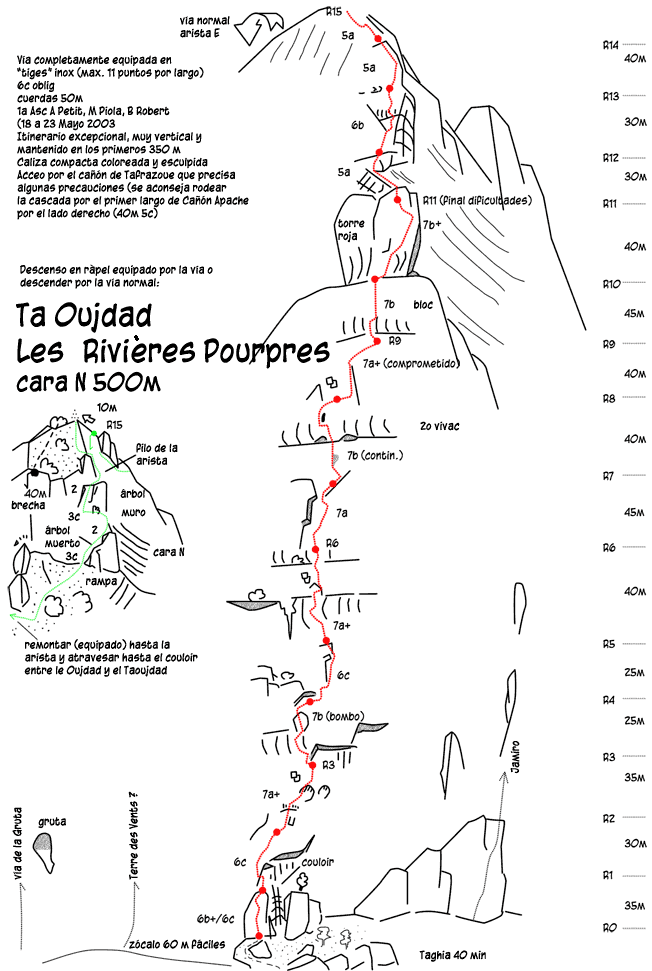 Esta fue nuestra tercera vía del viaje. Después de haber calentado motores en la Zebda y en la Libiti, y nunca mejor dicho, ya que de esta última tuvimos que bajarnos debido a un recalentón demasiado prolongado, decidimos apostar sobre seguro y buscar una vía en un muro con buena orientación. Resultado? La cara norte del Taoujad. La vía? La gran clásica de esta pared, abierta por Petit en el 2003.